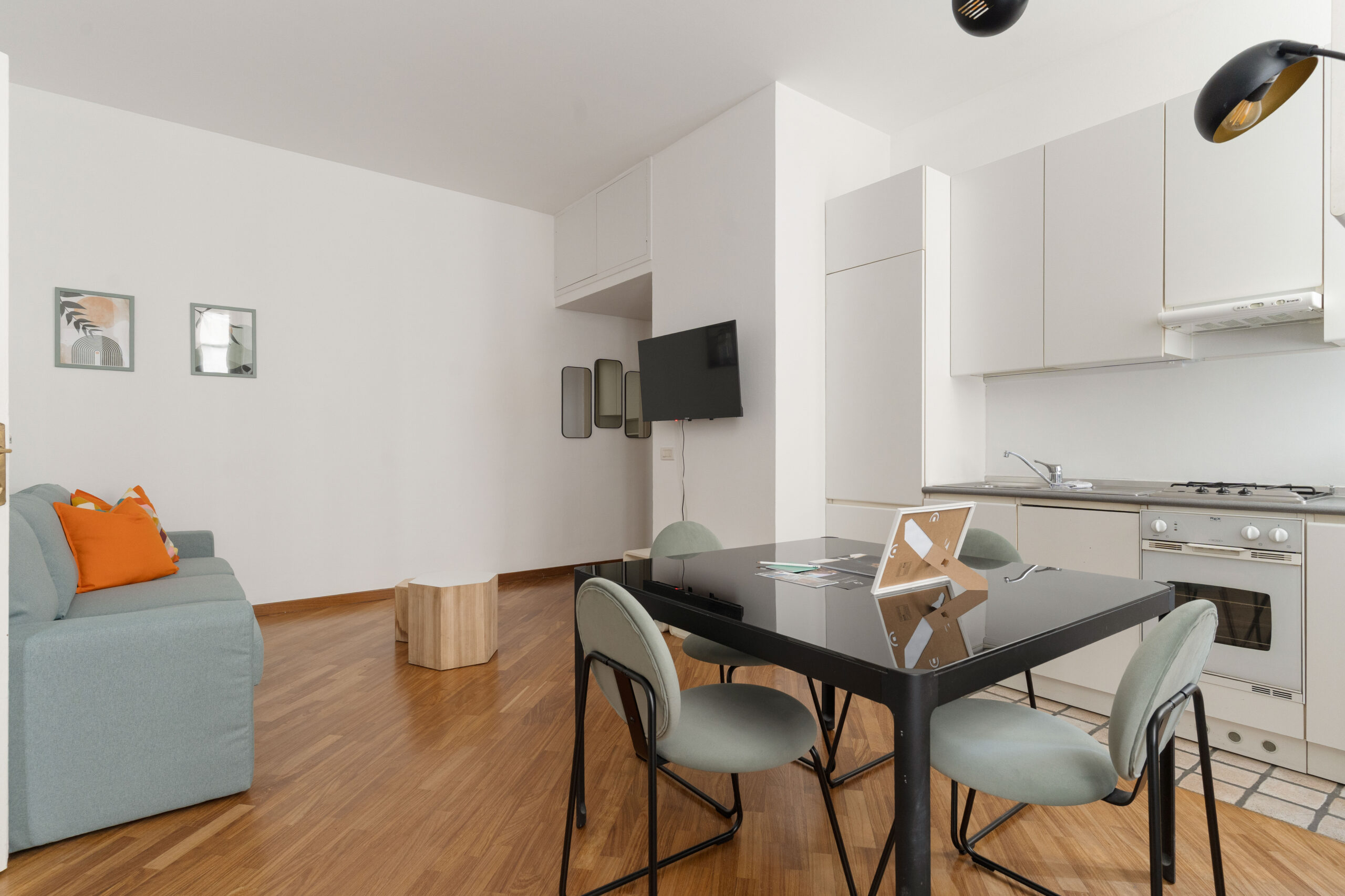 Dispone di un confortevole soggiorno con cucina a vista e divano letto, una camera da letto, un ampio bagno e un grazioso balconcino con affaccio interno.